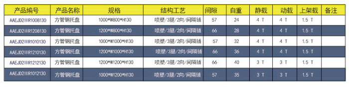 四向三腿——CM深槽板间隔铺面 技术参数说明: 产品编号: AATJD4ⅢC1212150 产品名称: CM面板川字钢托盘 产品规格: 1200*1200*150 产品自重: 34kg 防锈工艺: 静电沙纹喷塑 产品静载: 3000KG(均匀载重) 产品动载: 2000KG(均匀载重) 产品上架: 1200KG(均匀载重) 主要用途: 配合穿梭货架、立体仓库、车间周转、物流仓储